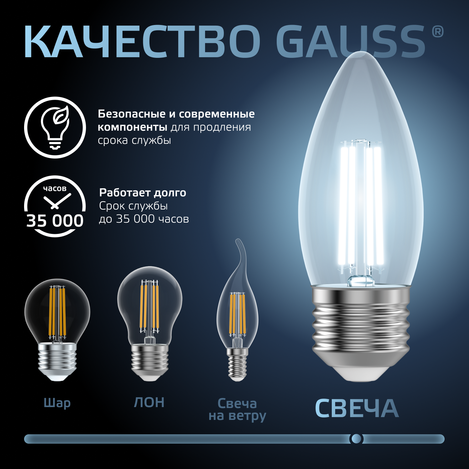 Светодиодные филаментные лампы GAUSS - это новейшие технологии в светотехнике. Лампы имеют привычный вид классических ламп накаливания, освещают пространство на 360о и дают больше света по сравнению с обычными светодиодными лампами за счет прозрачной колбы. Идеально подходят для хрустальных люстр и открытых светильников, а также для реализации дизайнерских решений, где важен вид классических ламп накаливания.